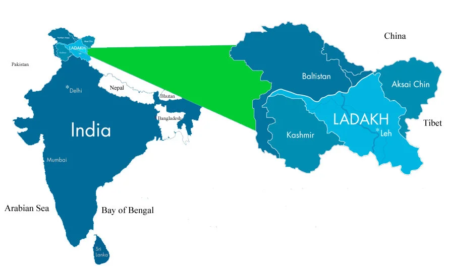 Ladakh is a remote region located in the northwest part of India, in the state of Jammu and Kashmir (Figure 2). The regions stretch from 33° to 35° latitude North and 76° to 79° longitude East and share India’s northern boundary with Pakistan and China. Ladakh is crossed by a system of mountain ranges running roughly parallel to each other from northwest to southeast. From north to south these are Karakoram, Ladakh, Zanskar and the Great Himalaya ranges, and these determine the course of Ladakh’s rivers. The drainage in Ladakh is provided by the Indus River which runs for approximately 450km and receives a series of glacier-fed tributaries from the north (for example Shyok, Shigar and Gilgit) and the south (Hanle, Zanskar and the Suru Shingo). Most of these lie parallel to the mountain ranges and run along fault lines.