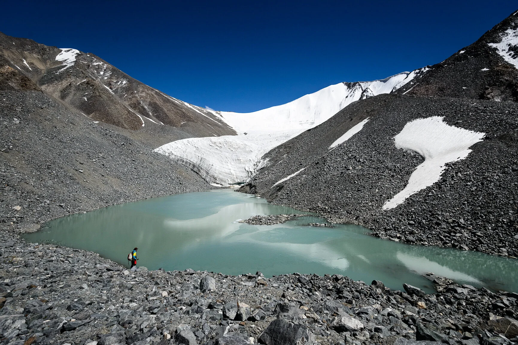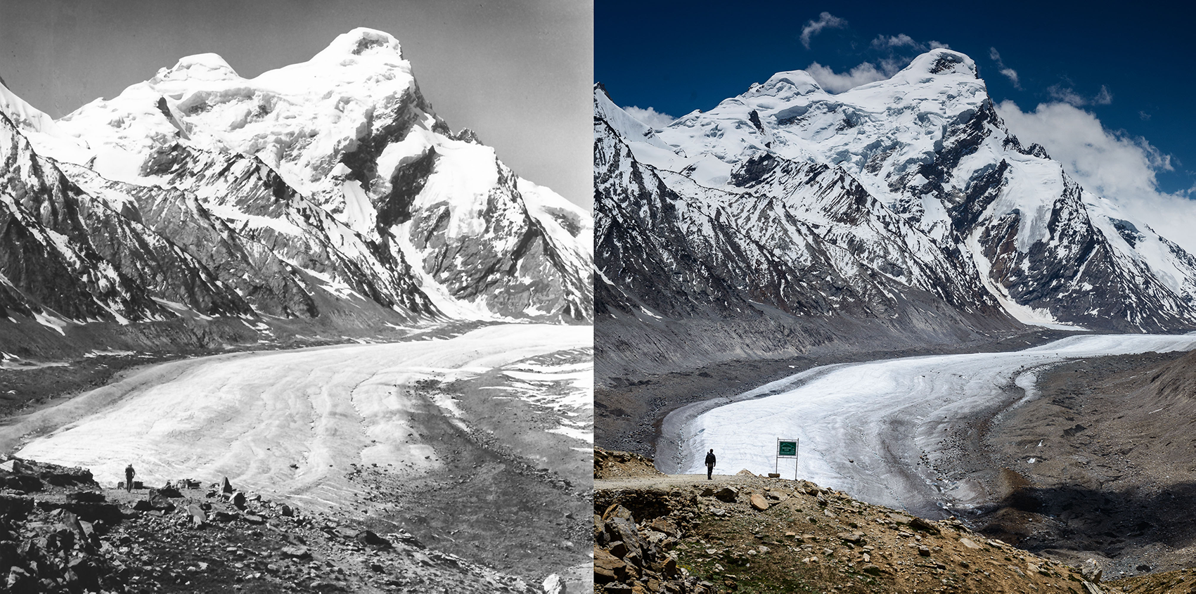Figure 7. Drang Drung Glacier, High Himalaya as seen from Pensi La (N 33.9377 / E 76.3686), left in 1980 and right in 2013. Man standing on path in the left side is used to estimate the scale o the image. Camera pitch orientation (azimuth toward direction of shot): 194°, elevation of camera position, 4383m. Camera type: Nikon D800; focal length: 70mm. (Left) ©Kirch Dieter, German Alpine Club, (Right) ©Christopher Rubey, 2013. Weathered conditions: sunny/ scattered clouds, wind blowing from west at about 1.5m/s.